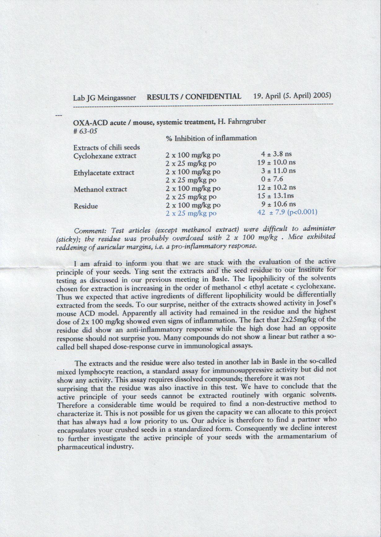 The seeds of the chilies used for the third and final ACD experiment of April 2005 were freeze-dried (Lyophilized). This freeze-drying process would have made the seeds very potent. Hence the seeds could have been so potent that even at 25 mg/kg the models were overdosed and therefore showed 42 % reduction and not higher. Likewise at 100mg/kg it was overdosed so much as to produce inflammation!